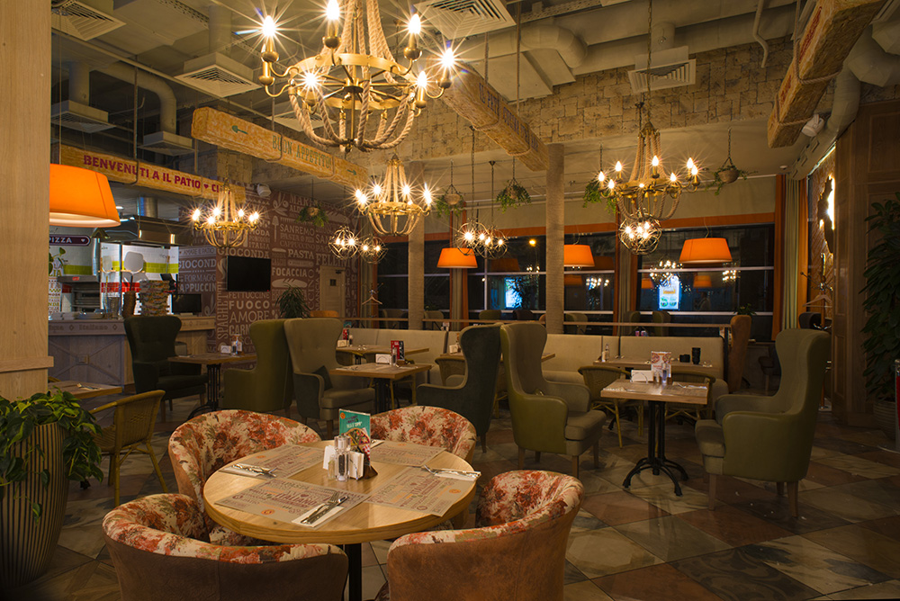 La cinquième place est occupée par un restaurant spacieux et lumineux. Suivant le concept conçu, ils n'ont pas attiré l'attention sur l'intérieur. À l’extérieur, l’institution ressemble aux rues accueillantes de l’Italie, où règnent beaucoup de verdure, de mandariniers, du soleil et des odeurs alléchantes. Le manque d’unité et la différence de mobilier, vaisselle - l’idée principale du design. Le hall principal, semblable à la zone du marché, où le comptoir et la chaussée sous leurs pieds peuvent accueillir de 70 à 90 personnes, et le foyer - de 80 à 90 personnes.